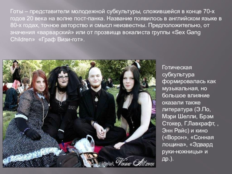 Слайд 21Готы – представители молодежной субкультуры, сложившейся в конце 70-х годов 20