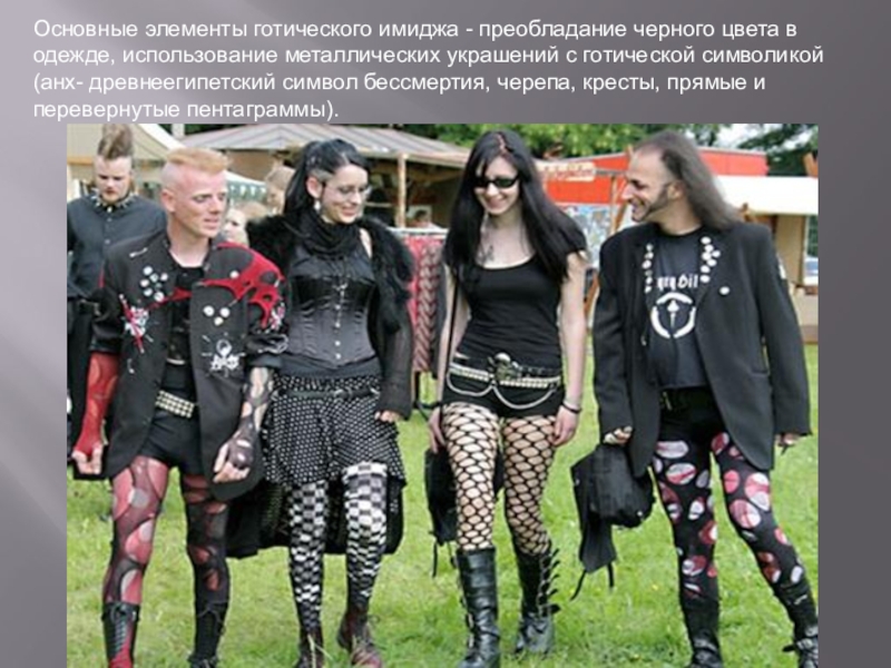 Слайд 22Основные элементы готического имиджа - преобладание черного цвета в одежде, использование