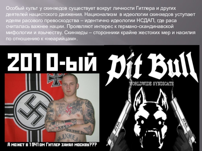 нацистского движения. Национализм в идеологии скинхедов уступает идеям расового превосходства – идентично идеологии НСДАП, где раса считалась важнее нации. Проявляют интерес к германо-скандинавской мифологии и язычеству. Скинхеды – сторонники крайне жестоких мер и насилия по отношению к «неарийцам».