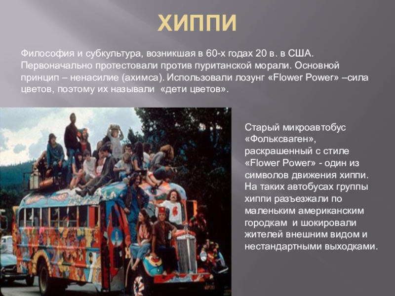Философия и субкультура, возникшая в 60-х годах 20 в. в США. Первоначально протестовали против пуританской морали. Основной принцип – ненасилие (ахимса). Использовали лозунг «Flower Power» –сила цветов, поэтому их называли «дети цветов».