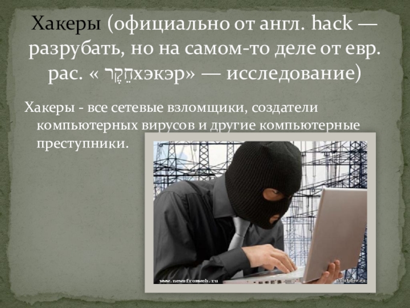 Хакеры (официально от англ. hack — разрубать, но на самом-то деле от евр. рас. « חֵקֶרхэкэр» — исследование)