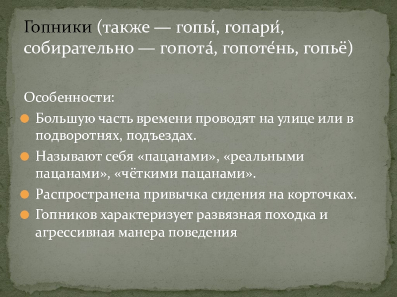 Гопники (также — гопы́, гопари́, собирательно — гопота́, гопоте́нь, гопьё)