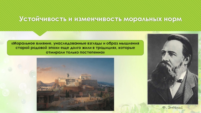 Устойчивость и изменчивость моральных нормФ. Энгельс«Моральное влияние, унаследованные взгляды и образ мышления старой родовой эпохи еще долго