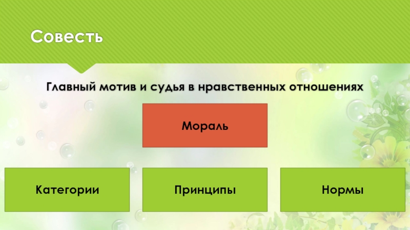 СовестьГлавный мотив и судья в нравственных отношенияхМоральПринципыНормыКатегории