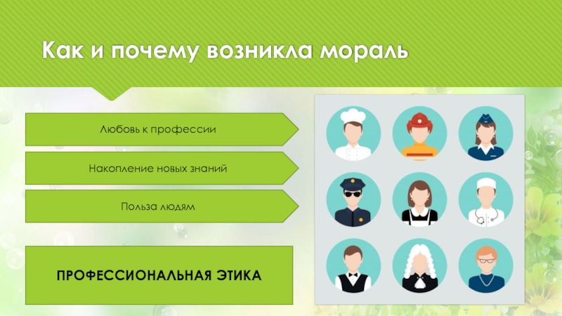 Как и почему возникла моральЛюбовь к профессииНакопление новых знанийПольза людямПРОФЕССИОНАЛЬНАЯ ЭТИКА