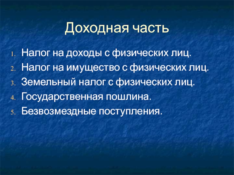 Доходная частьНалог на доходы с физических лиц.Налог на имущество с физических лиц.Земельный налог с физических лиц.Государственная пошлина.Безвозмездные