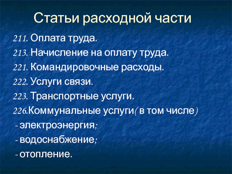 Статьи расходной части 211. Оплата труда.213. Начисление на оплату труда.221. Командировочные расходы.222. Услуги связи.223. Транспортные услуги.226.Коммунальные услуги(