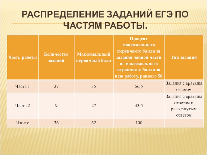 Слайд 5РАСПРЕДЕЛЕНИЕ ЗАДАНИЙ ЕГЭ ПО ЧАСТЯМ РАБОТЫ.