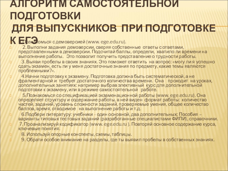 Слайд 13АЛГОРИТМ САМОСТОЯТЕЛЬНОЙ ПОДГОТОВКИ