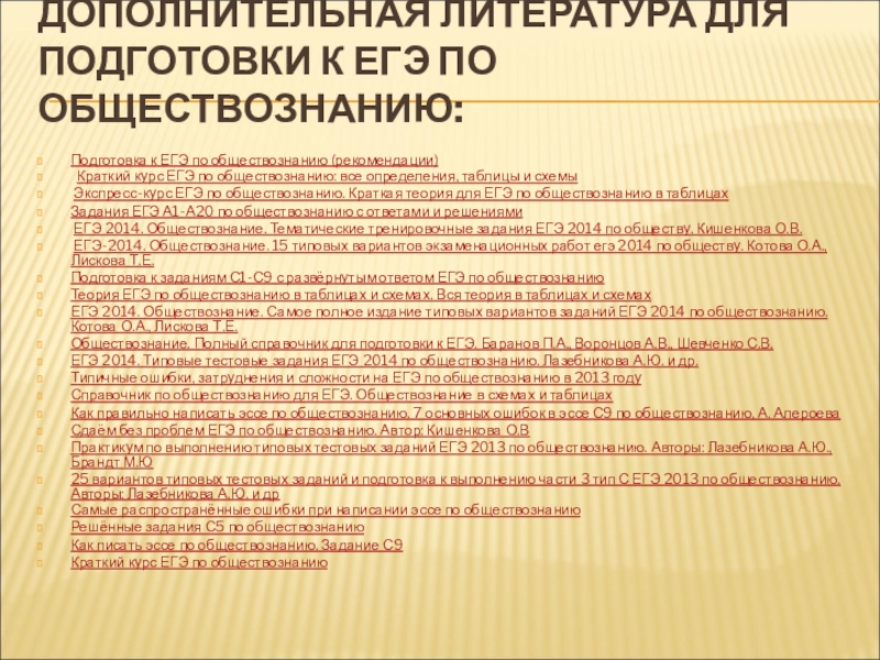 Слайд 20ДОПОЛНИТЕЛЬНАЯ ЛИТЕРАТУРА ДЛЯ ПОДГОТОВКИ К ЕГЭ ПО ОБЩЕСТВОЗНАНИЮ: