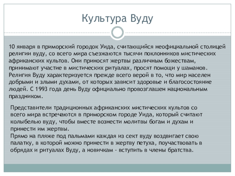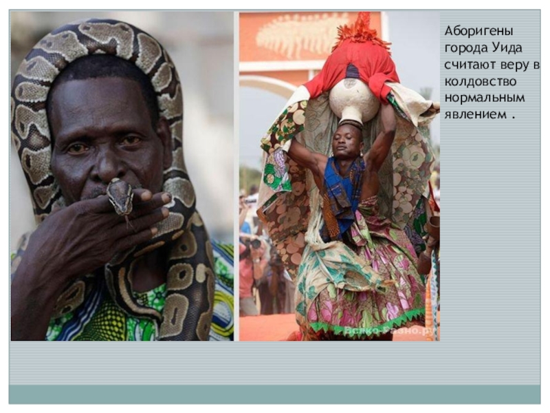 Представители традиционных африканских мистических культов со всего мира встречаются в приморском городе Уида, который считают колыбелью вуду, чтобы вместе вознести молитвы богам и духам и принести им жертвы.