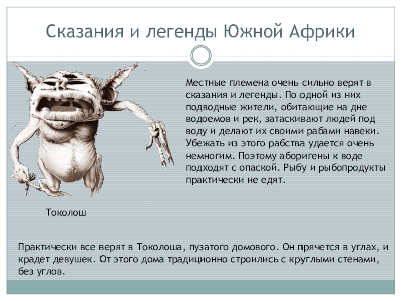 Практически все верят в Токолоша, пузатого домового. Он прячется в углах, и крадет девушек. От этого дома традиционно строились с круглыми стенами, без углов.
