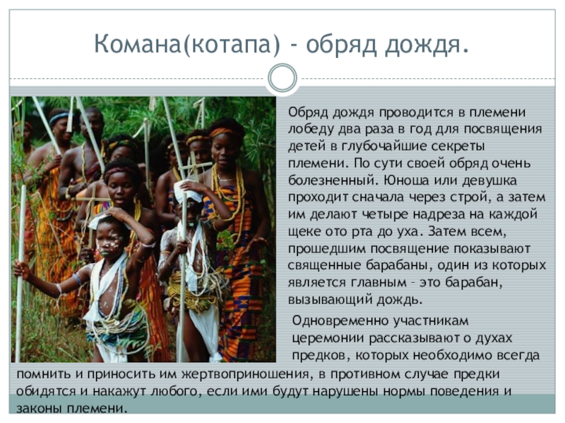 помнить и приносить им жертвоприношения, в противном случае предки обидятся и накажут любого, если ими будут нарушены нормы поведения и законы племени.
