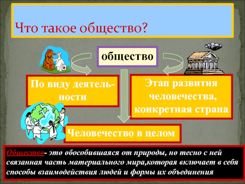 Что такое общество?обществоОбщество- это обособившаяся от природы, но тесно с нейсвязанная часть материального мира,которая включает в себяспособы