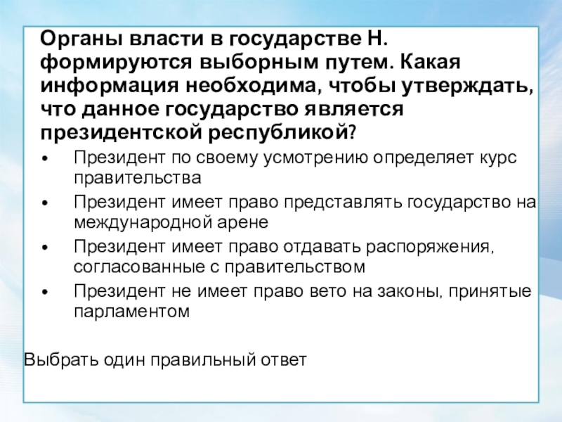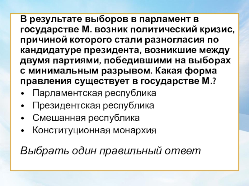 Слайд 50В результате выборов в парламент в государстве М. возник политический кризис,