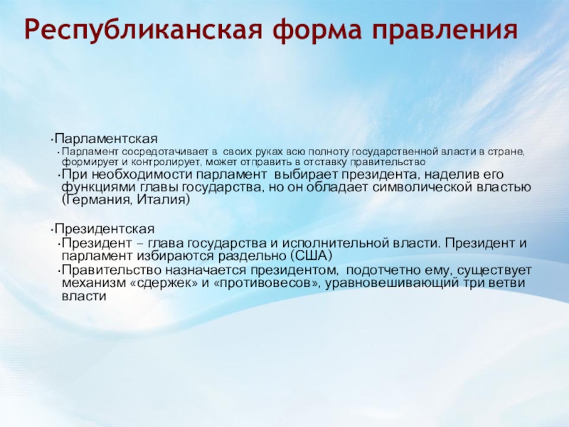 Выделите признаки парламентской республики:
