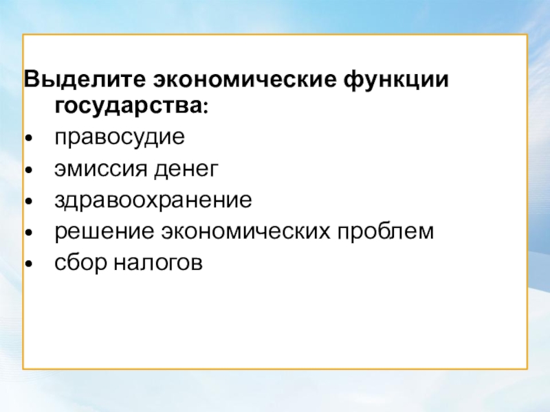 Выделите экономические функции государства: