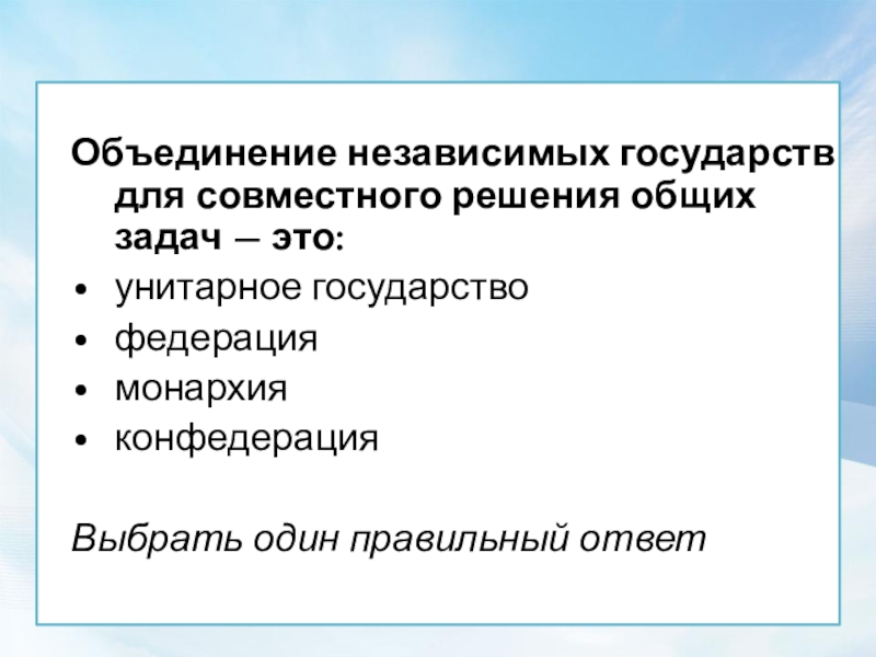Объединение независимых государств для совместного решения общих задач — это: