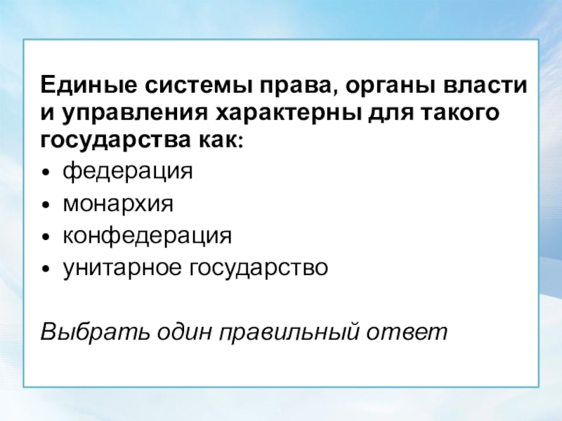 Единые системы права, органы власти и управления характерны для такого государства