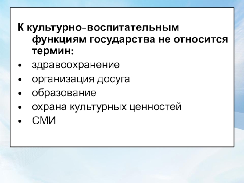 К культурно-воспитательным функциям государства не относится термин: