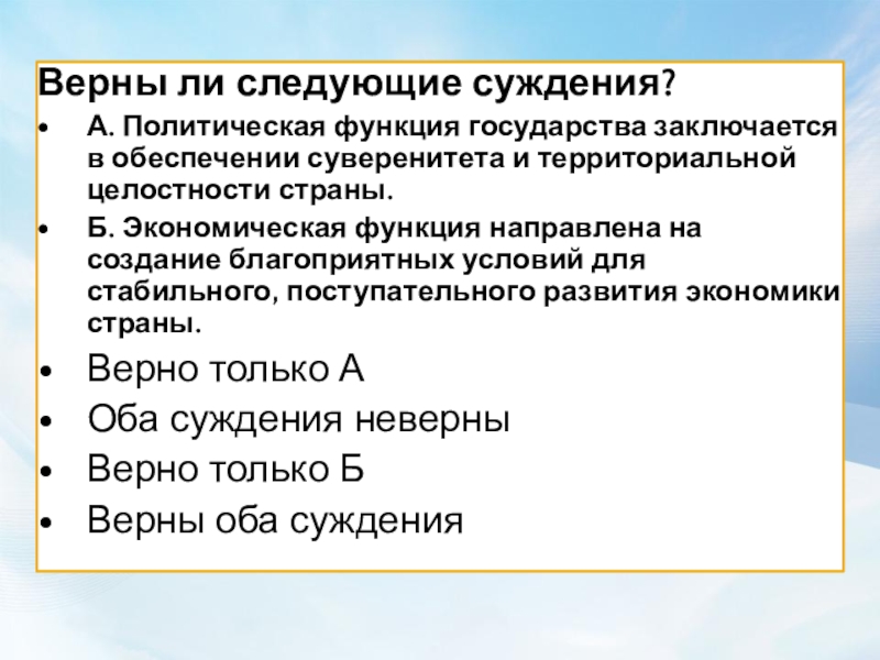 А. Политическая функция государства заключается в обеспечении суверенитета