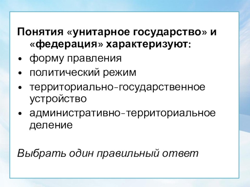 Понятия «унитарное государство» и «федерация» характеризуют: