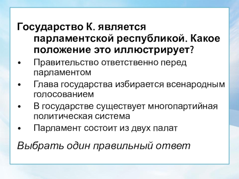 Государство К. является парламентской республикой. Какое положение это иллюстрирует?