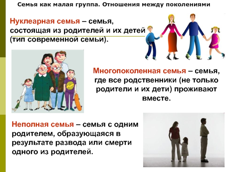 Семья как малая группа. Отношения между поколениямиНуклеарная семья – семья, состоящая из родителей и их детей (тип