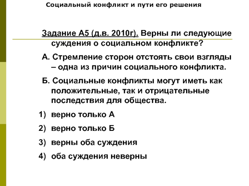 Социальный конфликт и пути его решенияЗадание А5 (д.в. 2010г). Верны ли следующие суждения о социальном конфликте?А. Стремление