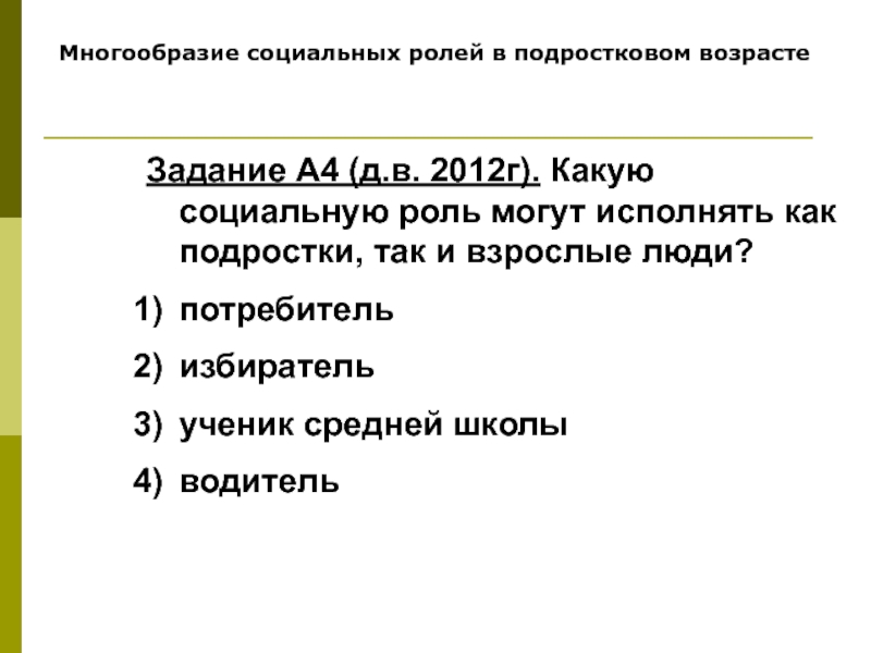 Многообразие социальных ролей в подростковом возрастеЗадание А4 (д.в. 2012г). Какую социальную роль могут исполнять как подростки, так