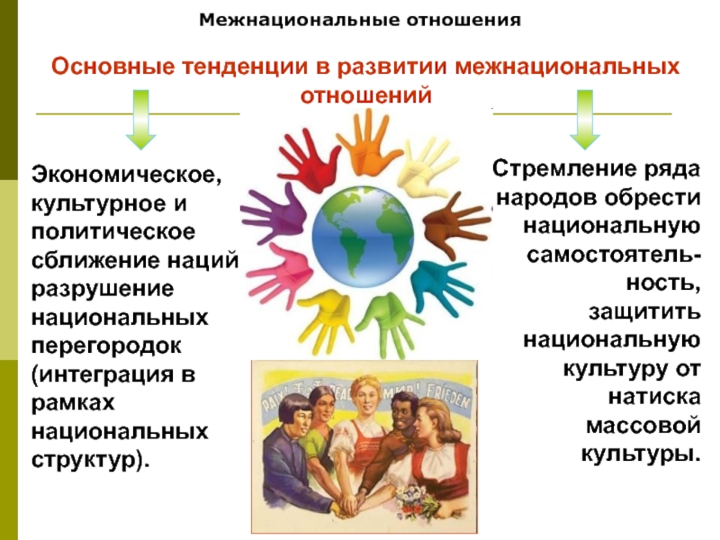 Межнациональные отношенияОсновные тенденции в развитии межнациональных отношенийЭкономическое, культурное и политическое сближение наций, разрушение национальных перегородок (интеграция в