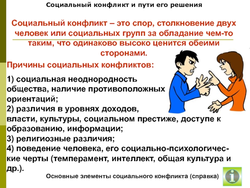 Социальный конфликт и пути его решенияПричины социальных конфликтов:1) социальная неоднородность