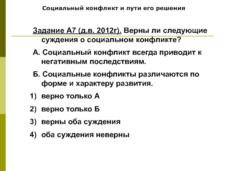 Социальный конфликт и пути его решенияЗадание А7 (д.в. 2012г). Верны ли следующие суждения о социальном конфликте?А. Социальный