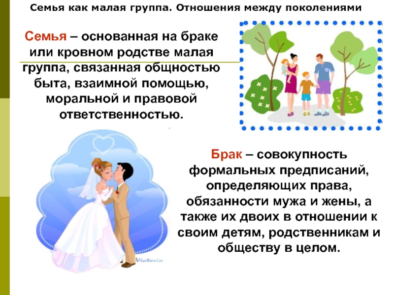 Семья как малая группа. Отношения между поколениямиСемья – основанная на браке или кровном родстве малая группа, связанная