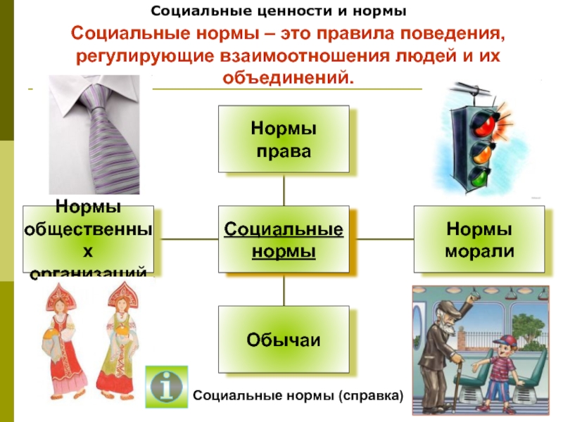 Социальные ценности и нормыНормы морали – правила, одобряемые большинством людей; образцы поведения, признанные в обществе обязательными (обычно