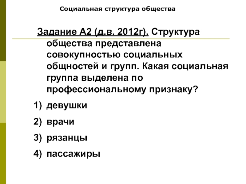 Социальная структура обществаЗадание А2 (д.в. 2012г). Структура общества представлена совокупностью социальных общностей и групп. Какая социальная группа