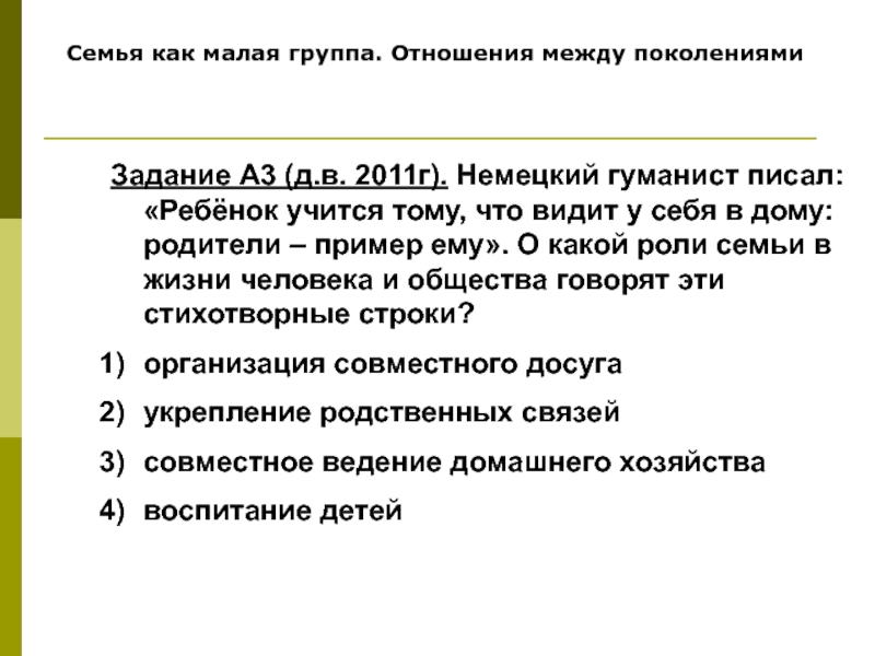 Семья как малая группа. Отношения между поколениямиЗадание А3 (д.в. 2011г). Немецкий гуманист писал: «Ребёнок учится тому, что