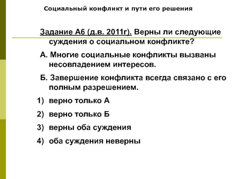 Социальный конфликт и пути его решенияЗадание А6 (д.в. 2011г). Верны ли следующие суждения о социальном конфликте?А. Многие