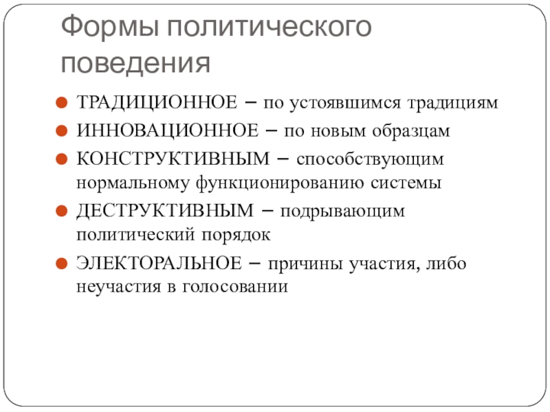 Формы политического поведенияТРАДИЦИОННОЕ – по устоявшимся традициямИННОВАЦИОННОЕ – по новым образцамКОНСТРУКТИВНЫМ – способствующим нормальному функционированию системыДЕСТРУКТИВНЫМ –
