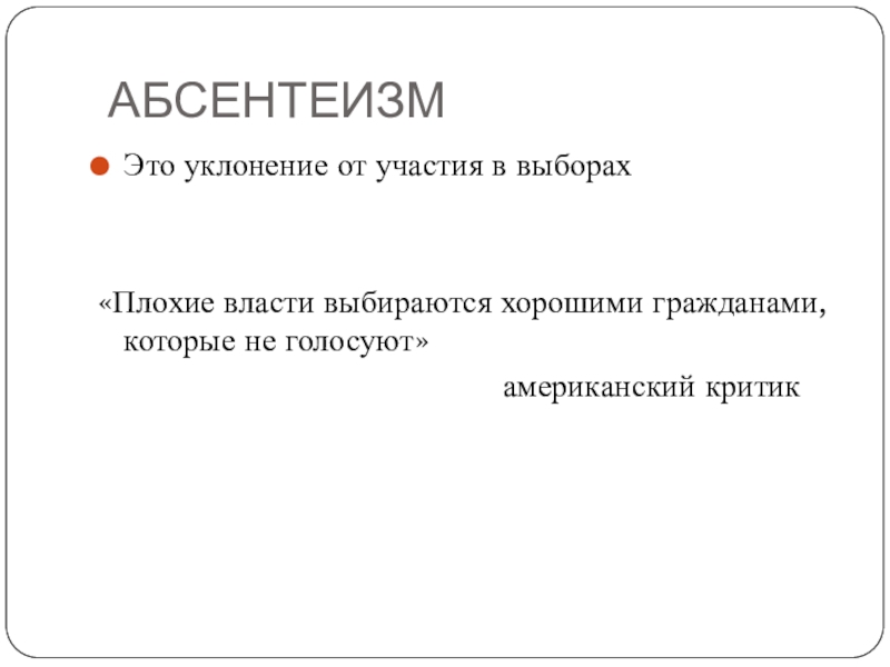 АБСЕНТЕИЗМЭто уклонение от участия в выборах«Плохие власти выбираются хорошими гражданами, которые не голосуют»