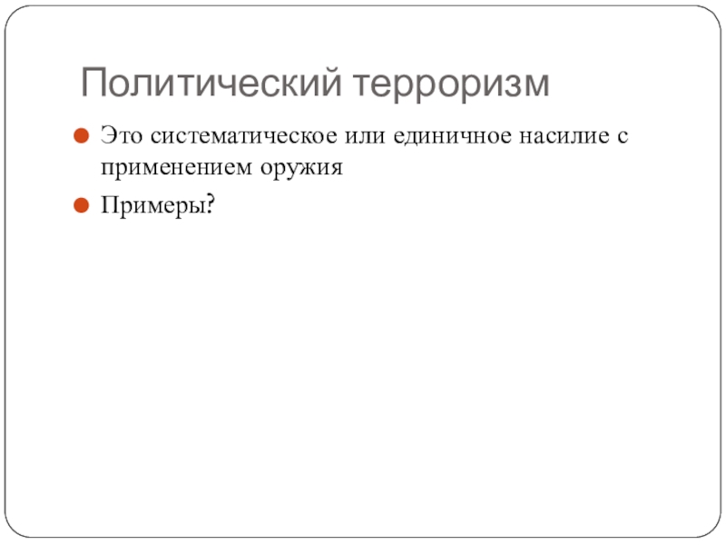 Политический терроризмЭто систематическое или единичное насилие с применением оружияПримеры?