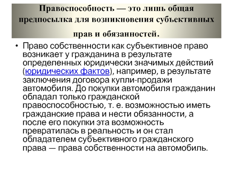 Право собственности как субъективное право возникает у гражданина в результате определенных юридически значимых действий (юридических фактов), например, в результате заключения договора купли-продажи автомобиля. До покупки автомобиля гражданин обладал только гражданской правоспособностью, т. е. возможностью иметь гражданские права и нести обязанности, а после его покупки эта возможность превратилась в реальность и он стал обладателем субъективного гражданского права — права собственности на автомобиль.
