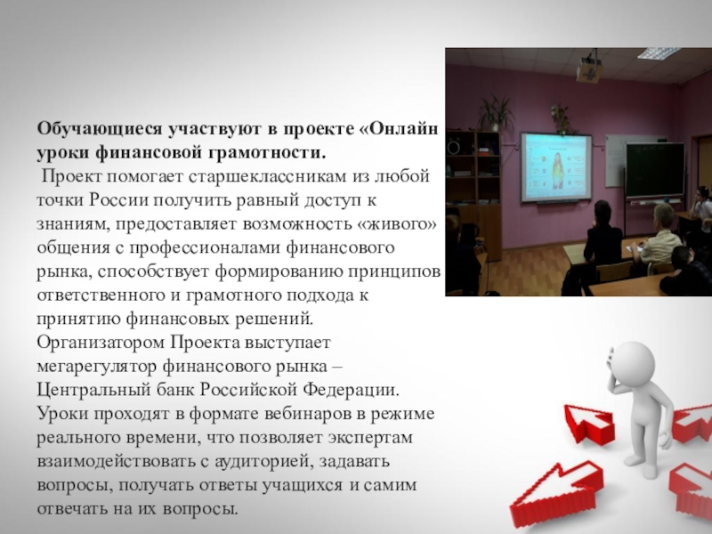 из любой точки России получить равный доступ к знаниям, предоставляет возможность «живого» общения с профессионалами финансового рынка, способствует формированию принципов ответственного и грамотного подхода к принятию финансовых решений.