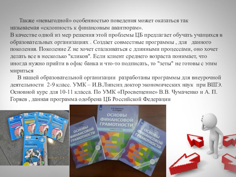 В нашей образовательной организации разработаны программы для внеурочной деятельности 2-9 класс. УМК – И.В.Липсиц доктор экономических наук при ВШЭ. Основной курс для 10-11 класса. По УМК «Просвещение» В.В. Чумаченко и А. П.Горяев , данная программа одобрена ЦБ Российской Федерации
