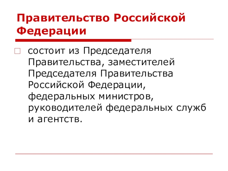 Правительство Российской Федерациисостоит из Председателя Правительства, заместителей Председателя Правительства Российской Федерации, федеральных министров, руководителей федеральных служб и