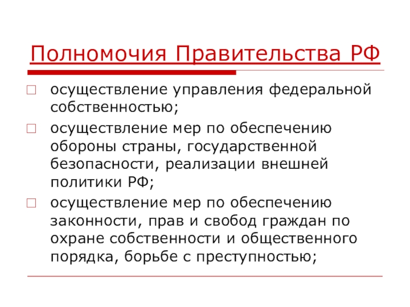 Полномочия Правительства РФосуществление управления федеральной собственностью;осуществление мер по обеспечению обороны страны, государственной безопасности, реализации внешней политики РФ;осуществление