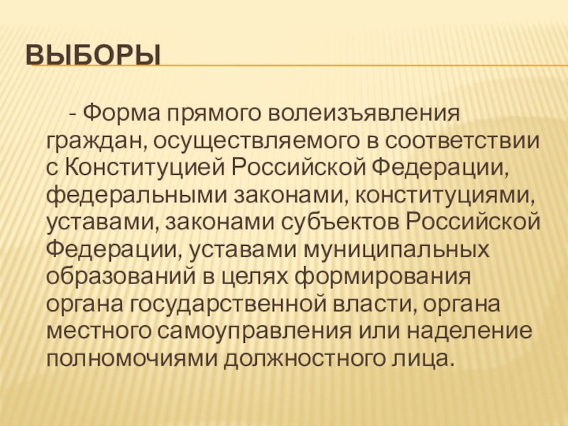 соответствии с Конституцией Российской Федерации, федеральными законами, конституциями, уставами, законами субъектов Российской Федерации, уставами муниципальных образований в целях формирования органа государственной власти, органа местного самоуправления или наделение полномочиями должностного лица.