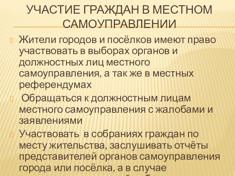 Участвовать в собраниях граждан по месту жительства, заслушивать отчёты представителей органов самоуправления города или посёлка, а в случае неудовлетворительной работы отзывать их в установленном законом порядке.