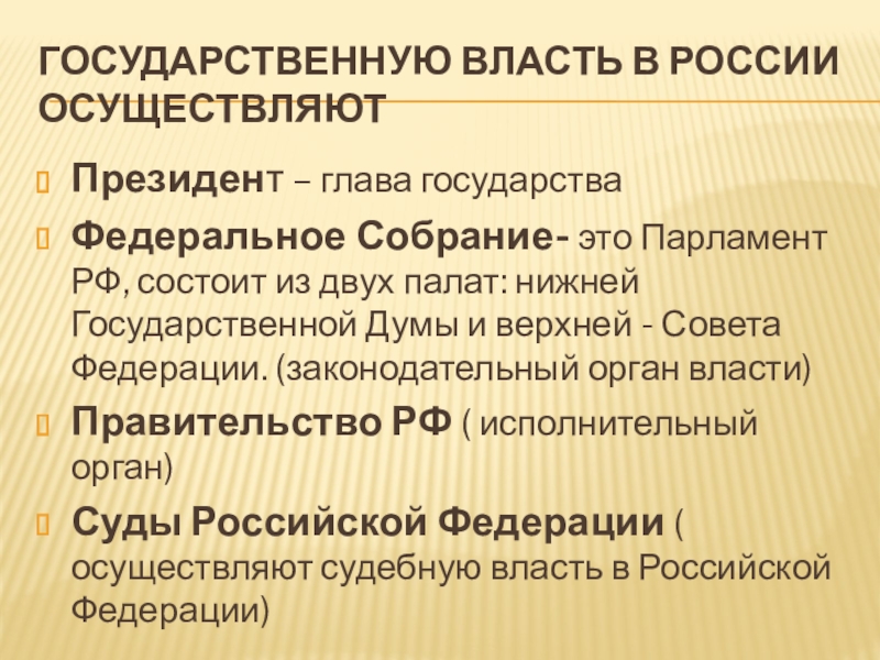 РФ, состоит из двух палат: нижней Государственной Думы и верхней - Совета Федерации. (законодательный орган власти)