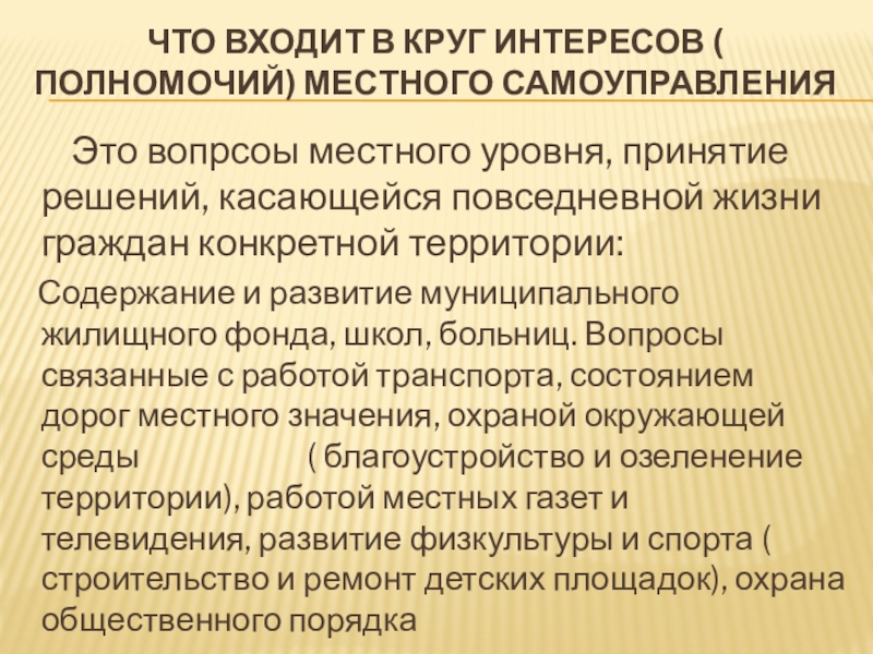 Слайд 16Что входит в круг интересов ( полномочий) местного самоуправления